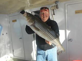 We had a few shots of fish early in the day mostly 24 to 26 inch fish but a few keepers. Everything went quiet for awhile and we did a little searching. Finally later in the day they decided to eat. It wasn't easy fishing you had to put a little effort into it. The boat traffic was horrible it was like a summer weekend out there today But almost everyone caught at least a few and some guys did better then others. If you could have seen the fish finder you would have thought the whole boat would have one on at times. But we picked away, We ended up with some more keepers and plenty of 24 to 27 inch Stripers that we threw back.All fish were caught on diamond jigs and rubber shads. It was a good finish to the day. All in all a fun day on the water.